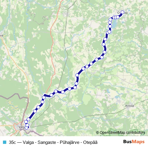 The first stop of the 35c bus route is Valga bussijaam and the last stop is Otepää. 35c (Valga - Sangaste - Pühajärve - Otepää) is operational during everyday.