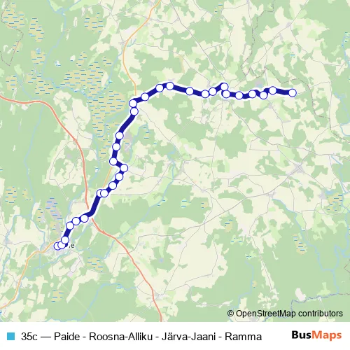 The first stop of the 35c bus route is Paide bussijaam 2 and the last stop is Ramma. 35c (Paide - Roosna-Alliku - Järva-Jaani - Ramma) is operational during everyday.