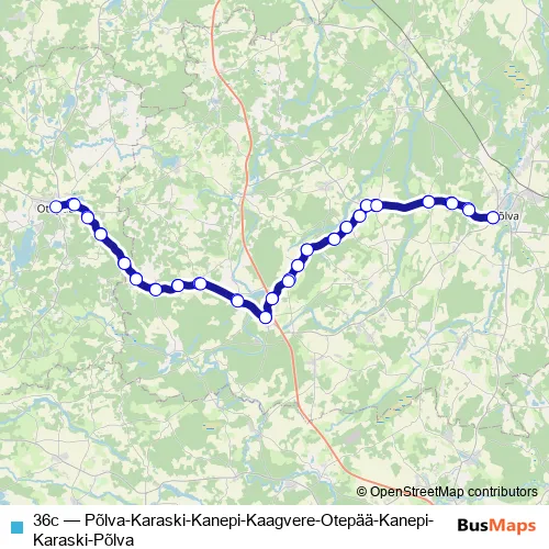 The first stop of the 36c bus route is Põlva bussijaam and the last stop is Põlva bussijaam. 36c (Põlva-Karaski-Kanepi-Kaagvere-Otepää-Kanepi-Karaski-Põlva) is operational during everyday.