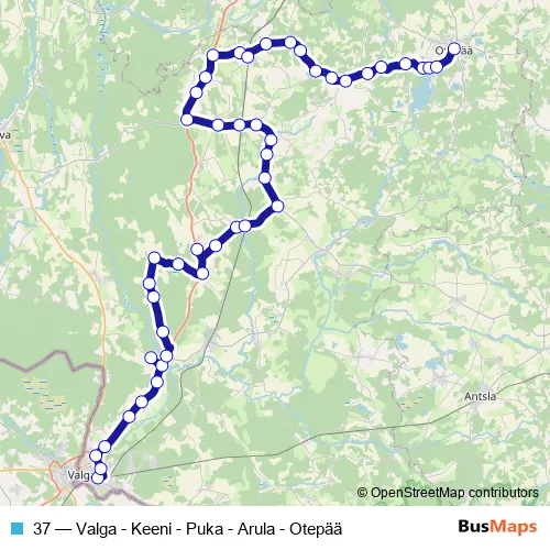 The first stop of the 37 bus route is Valga bussijaam and the last stop is Otepää. 37 (Valga - Keeni - Puka - Arula - Otepää) is operational during everyday.
