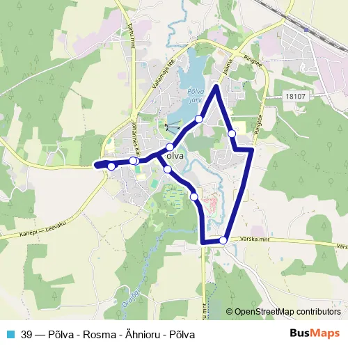 The first stop of the 39 bus route is Põlva bussijaam and the last stop is Põlva bussijaam. 39 (Põlva - Rosma - Ähnioru - Põlva) is operational during on weekdays.