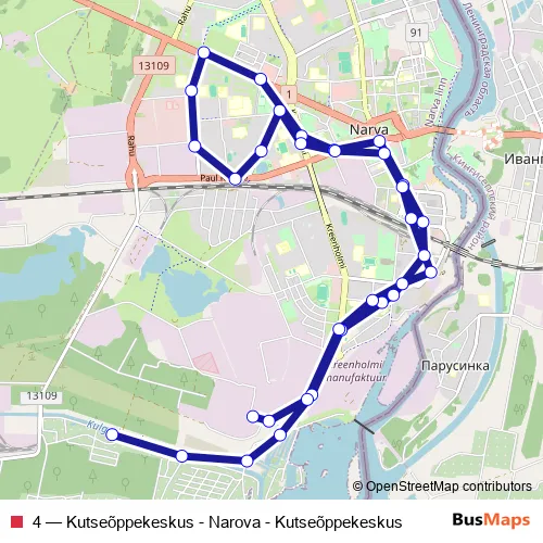 The first stop of the 4 bus route is Aiandusühistu Metsaonnid (Romaška) and the last stop is Viimistlusvabrik. 4 (Kutseõppekeskus - Narova - Kutseõppekeskus) is operational during everyday.