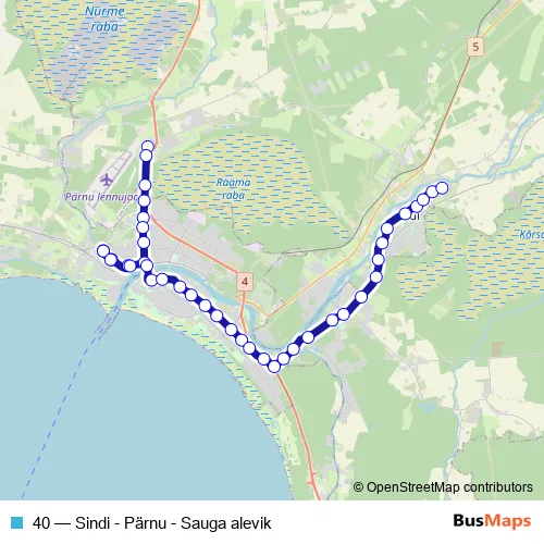 The first stop of the 40 bus route is Madise and the last stop is Tammeoja. 40 (Sindi - Pärnu - Sauga alevik) is operational during everyday.