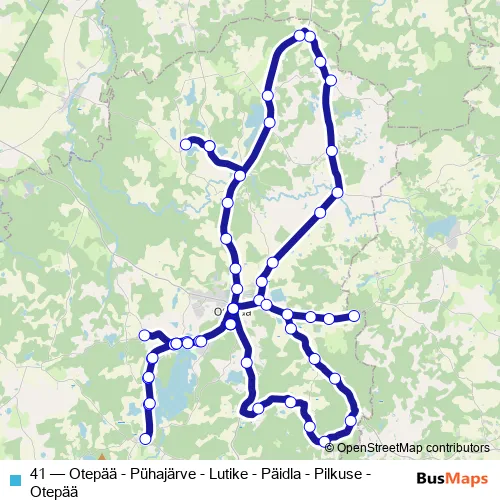 The first stop of the 41 bus route is Otepää and the last stop is Otepää. 41 (Otepää - Pühajärve - Lutike - Päidla - Pilkuse - Otepää) is operational during on weekdays.