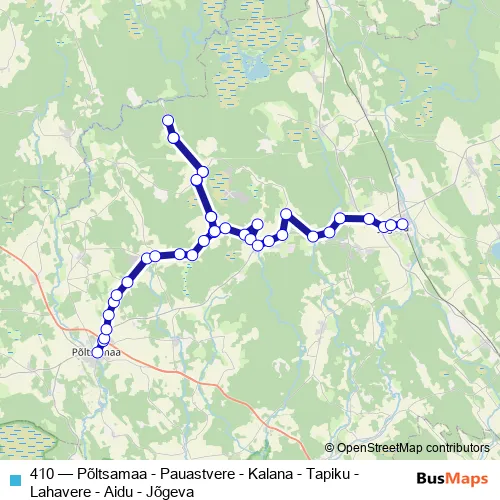 The first stop of the 410 bus route is Põltsamaa and the last stop is Jõgeva. 410 (Põltsamaa - Pauastvere - Kalana - Tapiku - Lahavere - Aidu - Jõgeva) is operational during everyday.