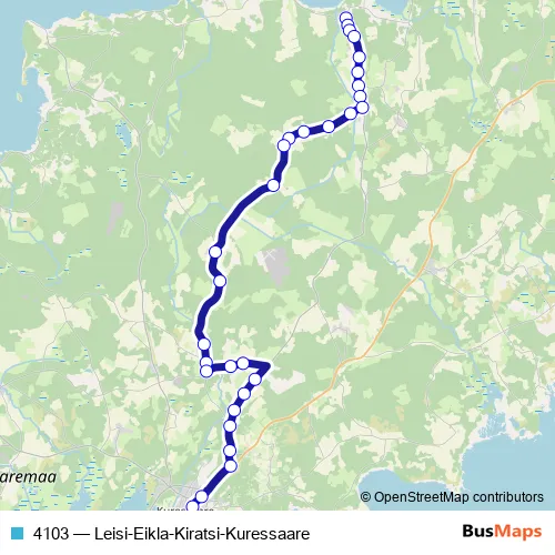 The first stop of the 4103 bus route is Leisi and the last stop is Kuressaare. 4103 (Leisi-Eikla-Kiratsi-Kuressaare) is operational during everyday.