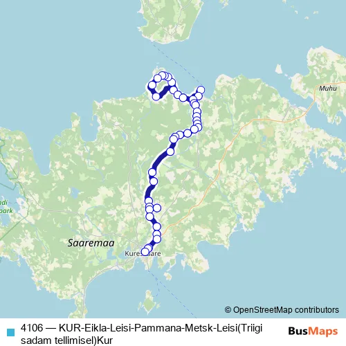 The first stop of the 4106 bus route is Kuressaare (2) and the last stop is Kuressaare. 4106 (KUR-Eikla-Leisi-Pammana-Metsk-Leisi(Triigi sadam tellimisel)Kur) is operational during everyday.