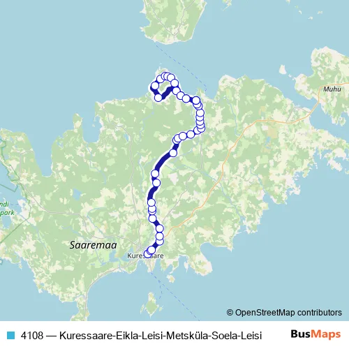 The first stop of the 4108 bus route is Kuressaare (2) and the last stop is Leisi. 4108 (Kuressaare-Eikla-Leisi-Metsküla-Soela-Leisi) is operational during everyday.