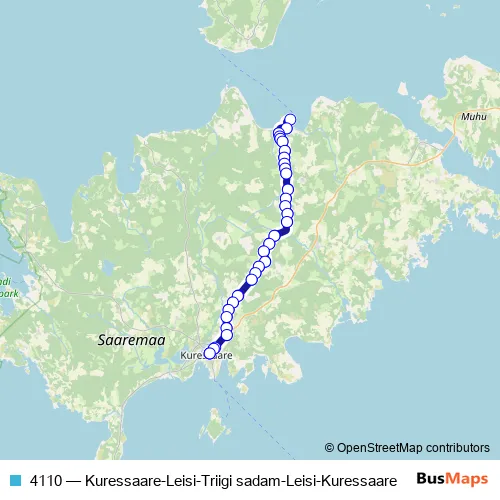 The first stop of the 4110 bus route is Kuressaare (2) and the last stop is Kuressaare. 4110 (Kuressaare-Leisi-Triigi sadam-Leisi-Kuressaare) is operational during everyday.