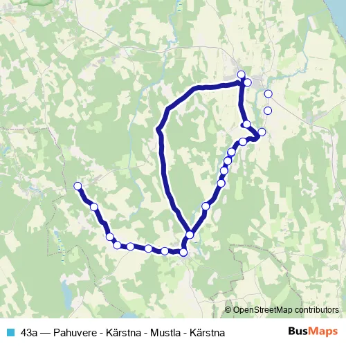 The first stop of the 43a bus route is Pahuvere and the last stop is Kärstna. 43a (Pahuvere - Kärstna - Mustla - Kärstna) is operational during on weekdays.