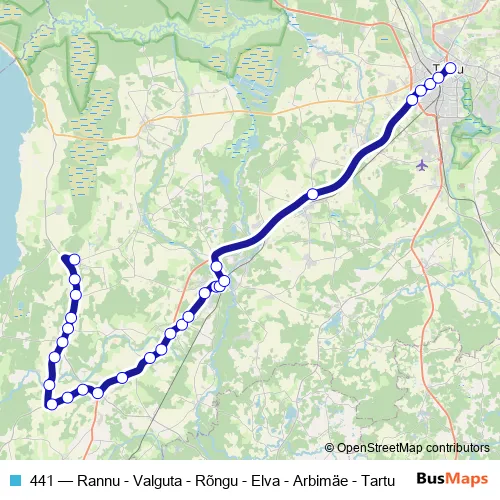 The first stop of the 441 bus route is Rannu and the last stop is Tartu bussijaam. 441 (Rannu - Valguta - Rõngu - Elva - Arbimäe - Tartu) is operational during on weekdays.
