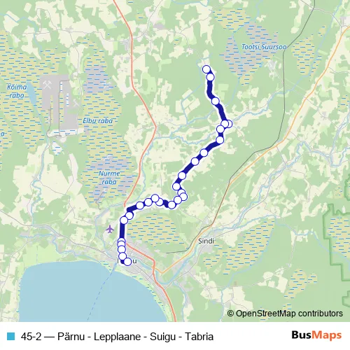 The first stop of the 45-2 bus route is Tabria and the last stop is Pärnu bussijaam. 45-2 (Pärnu - Lepplaane - Suigu - Tabria) is operational during everyday.