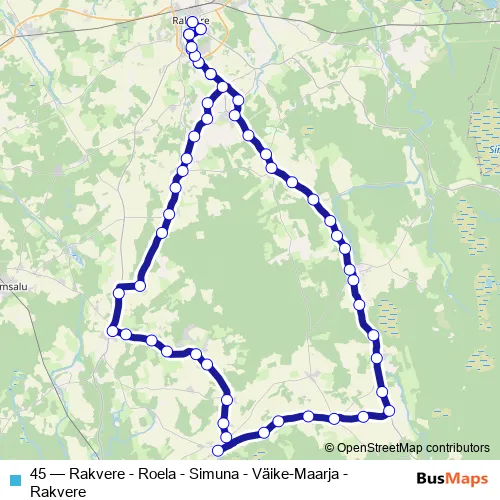 The first stop of the 45 bus route is Rakvere bussijaam and the last stop is Rakvere bussijaam. 45 (Rakvere - Roela - Simuna - Väike-Maarja - Rakvere) is operational during everyday.