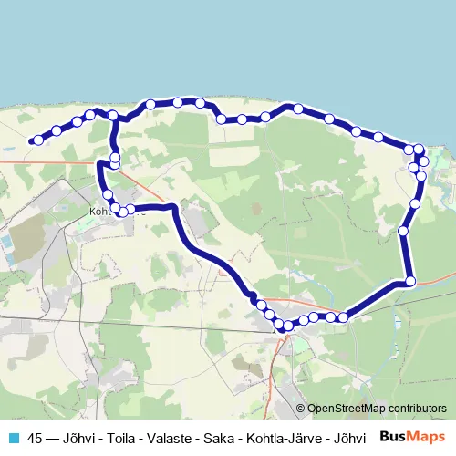 The first stop of the 45 bus route is Jõhvi bussijaam and the last stop is Jõhvi bussijaam (saabuvad). 45 (Jõhvi - Toila - Valaste - Saka - Kohtla-Järve - Jõhvi) is operational during on weekdays.
