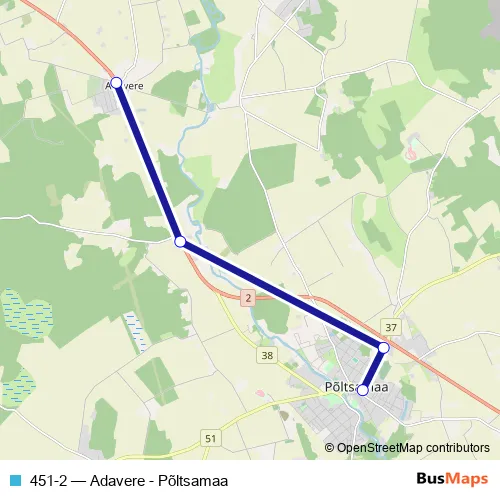 The first stop of the 451-2 bus route is Adavere and the last stop is Põltsamaa. 451-2 (Adavere - Põltsamaa) is operational during everyday.