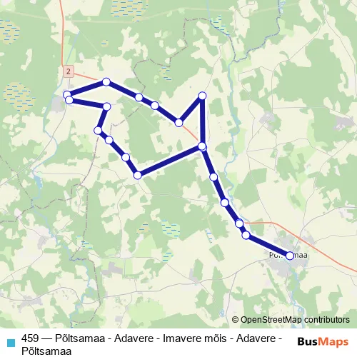 The first stop of the 459 bus route is Põltsamaa and the last stop is Põltsamaa. 459 (Põltsamaa - Adavere - Imavere mõis - Adavere - Põltsamaa) is operational during everyday.