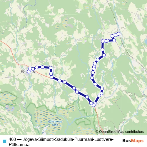 The first stop of the 463 bus route is Jõgeva and the last stop is Põltsamaa. 463 (Jõgeva-Siimusti-Saduküla-Puurmani-Lustivere-Põltsamaa) is operational during everyday.