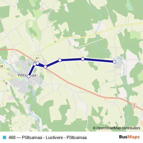 The first stop of the 468 bus route is Põltsamaa and the last stop is Põltsamaa. 468 (Põltsamaa - Lustivere - Põltsamaa) is operational during on weekdays.