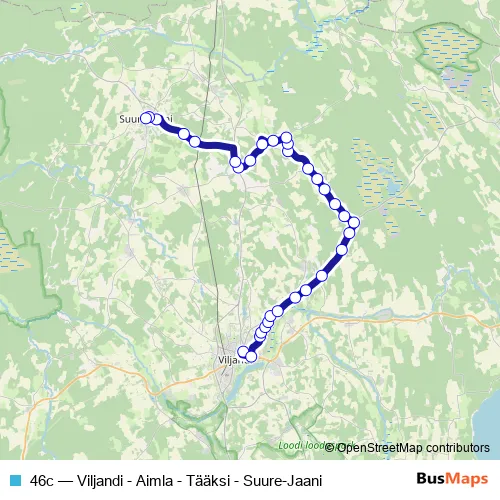 The first stop of the 46c bus route is Viljandi bussijaam and the last stop is Suure-Jaani. 46c (Viljandi - Aimla - Tääksi - Suure-Jaani) is operational during on weekdays.