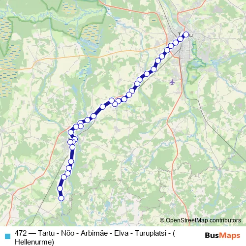 The first stop of the 472 bus route is Tartu bussijaam and the last stop is Hellenurme. 472 (Tartu - Nõo - Arbimäe - Elva - Turuplatsi - (Hellenurme)) is operational during everyday.