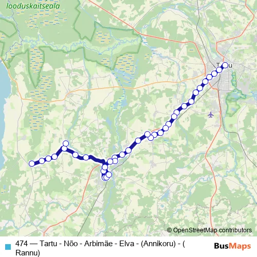 The first stop of the 474 bus route is Tartu bussijaam and the last stop is Rannu. 474 (Tartu - Nõo - Arbimäe - Elva - (Annikoru) - (Rannu)) is operational during everyday.