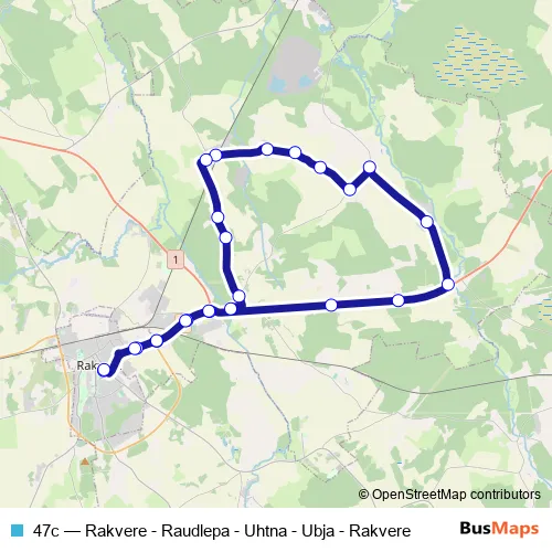 The first stop of the 47c bus route is Rakvere bussijaam and the last stop is Rakvere bussijaam. 47c (Rakvere - Raudlepa - Uhtna - Ubja - Rakvere) is operational during on weekdays.