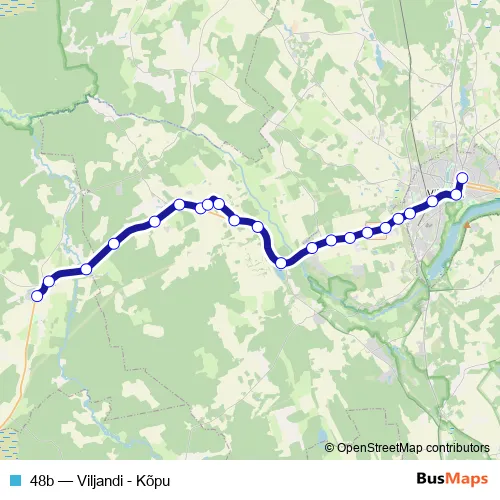 The first stop of the 48b bus route is Kõpu and the last stop is Viljandi bussijaam. 48b (Viljandi - Kõpu) is operational during on weekends.