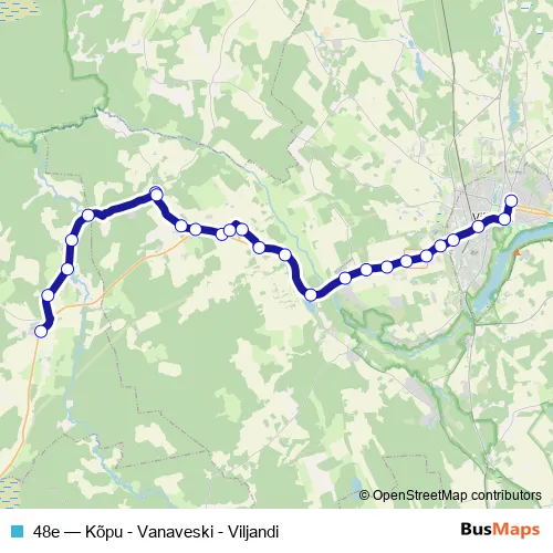 The first stop of the 48e bus route is Kõpu and the last stop is Viljandi bussijaam. 48e (Kõpu - Vanaveski - Viljandi) is operational during on weekdays.