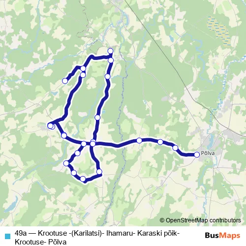The first stop of the 49a bus route is Krootuse and the last stop is Põlva bussijaam. 49a (Krootuse -(Karilatsi)- Ihamaru- Karaski põik- Krootuse- Põlva) is operational during on weekdays.