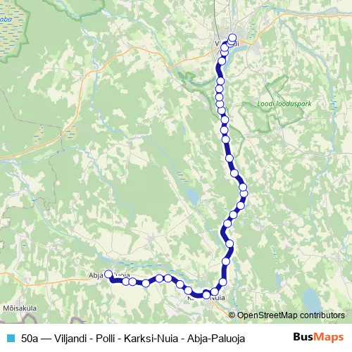 The first stop of the 50a bus route is Abja-Paluoja and the last stop is Viljandi bussijaam. 50a (Viljandi - Polli - Karksi-Nuia - Abja-Paluoja) is operational during everyday.