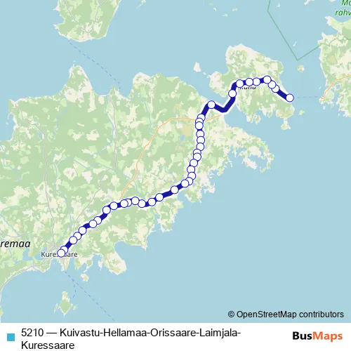 The first stop of the 5210 bus route is Kuivastu and the last stop is Kuressaare. 5210 (Kuivastu-Hellamaa-Orissaare-Laimjala-Kuressaare) is operational during on weekdays.