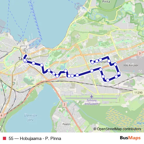 The first stop of the 55 bus route is P. Pinna and the last stop is A. Laikmaa. 55 (Hobujaama - P. Pinna) is operational during on weekdays.