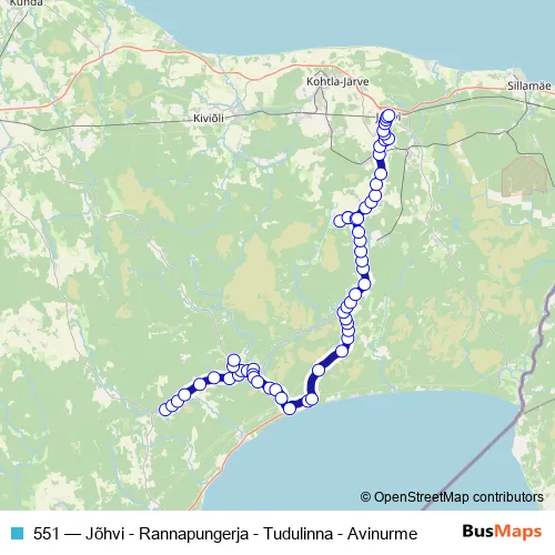 The first stop of the 551 bus route is Avinurme and the last stop is Jõhvi bussijaam (saabuvad). 551 (Jõhvi - Rannapungerja - Tudulinna - Avinurme) is operational during everyday.