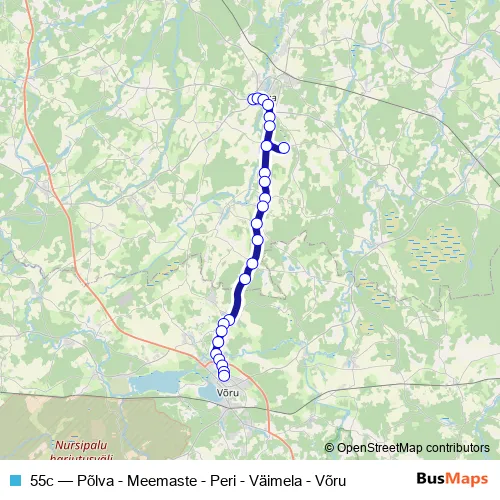The first stop of the 55c bus route is Põlva bussijaam and the last stop is Võru bussijaam. 55c (Põlva - Meemaste - Peri - Väimela - Võru) is operational during everyday.