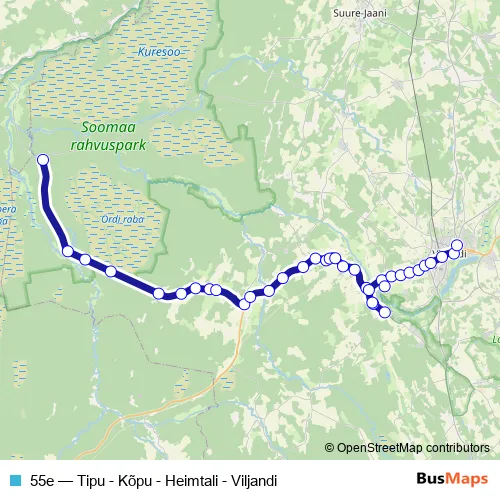 The first stop of the 55e bus route is Kõrtsi-Tõramaa and the last stop is Viljandi bussijaam. 55e (Tipu - Kõpu - Heimtali - Viljandi) is operational during everyday.