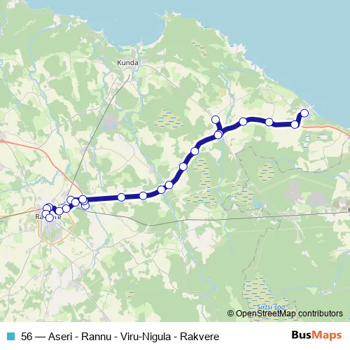 The first stop of the 56 bus route is Aseri and the last stop is Rakvere bussijaam. 56 (Aseri - Rannu - Viru-Nigula - Rakvere) is operational during everyday.
