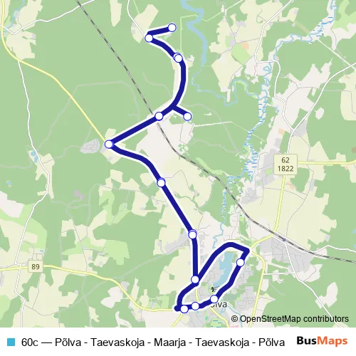 The first stop of the 60c bus route is Põlva bussijaam and the last stop is Põlva bussijaam. 60c (Põlva - Taevaskoja - Maarja - Taevaskoja - Põlva) is operational during everyday.