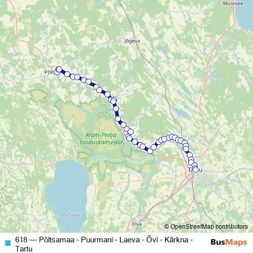 The first stop of the 618 bus route is Põltsamaa and the last stop is Tartu bussijaam. 618 (Põltsamaa - Puurmani - Laeva - Õvi - Kärkna - Tartu) is operational during everyday.