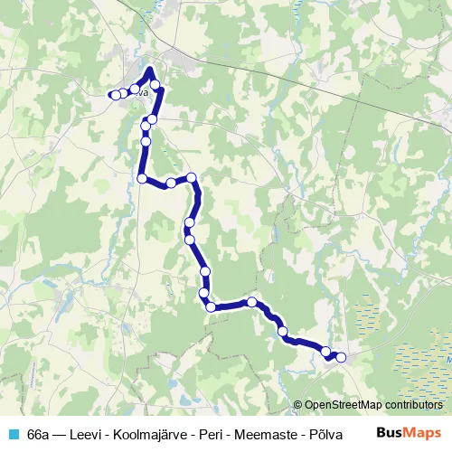The first stop of the 66a bus route is Leevi and the last stop is Põlva bussijaam. 66a (Leevi - Koolmajärve - Peri - Meemaste - Põlva) is operational during everyday.