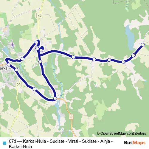 The first stop of the 67d bus route is Karksi-Nuia and the last stop is Karksi-Nuia. 67d (Karksi-Nuia - Sudiste - Virsti - Sudiste - Ainja - Karksi-Nuia) is operational during everyday.