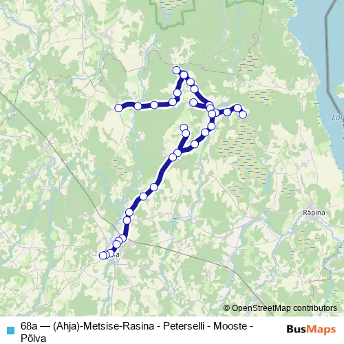 The first stop of the 68a bus route is Ahja and the last stop is Põlva bussijaam. 68a ((Ahja)-Metsise-Rasina - Peterselli - Mooste - Põlva) is operational during everyday.
