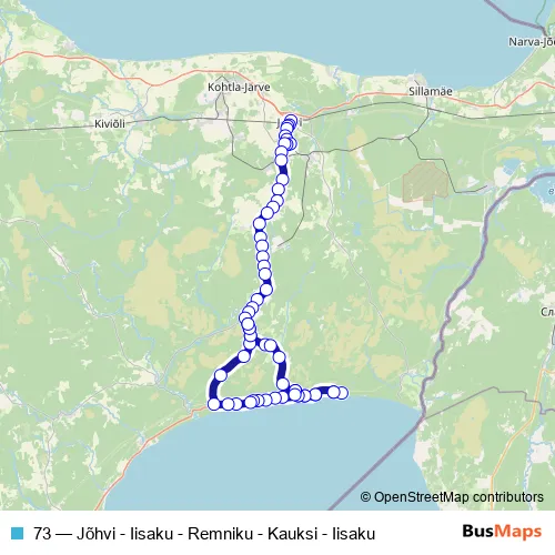 The first stop of the 73 bus route is Jõhvi bussijaam and the last stop is Iisaku. 73 (Jõhvi - Iisaku - Remniku - Kauksi - Iisaku) is operational during on weekdays.