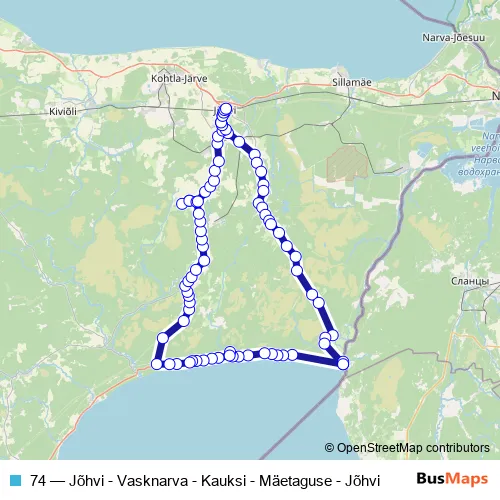 The first stop of the 74 bus route is Jõhvi bussijaam and the last stop is Jõhvi bussijaam (saabuvad). 74 (Jõhvi - Vasknarva - Kauksi - Mäetaguse - Jõhvi) is operational during everyday.