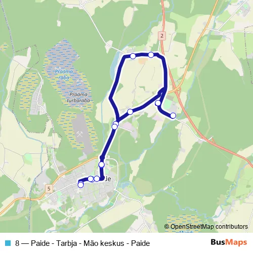 The first stop of the 8 bus route is Paide bussijaam 1 and the last stop is Paide bussijaam 6. 8 (Paide - Tarbja - Mäo keskus - Paide) is operational during on weekdays.