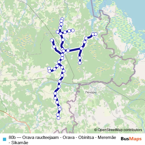 The first stop of the 80b bus route is Orava raudteejaam and the last stop is Sikamäe. 80b (Orava raudteejaam - Orava - Obinitsa - Meremäe - Sikamäe) is operational during on weekdays.