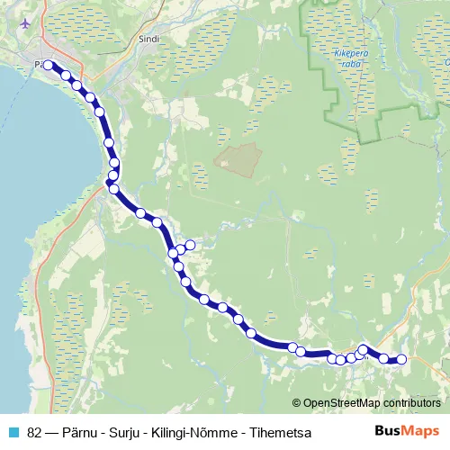 The first stop of the 82 bus route is Pärnu bussijaam and the last stop is Tihemetsa. 82 (Pärnu - Surju - Kilingi-Nõmme - Tihemetsa) is operational during on weekdays.