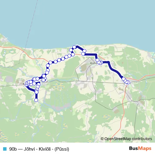 The first stop of the 90b bus route is Jõhvi bussijaam and the last stop is Püssi. 90b (Jõhvi - Kiviõli - (Püssi)) is operational during everyday.