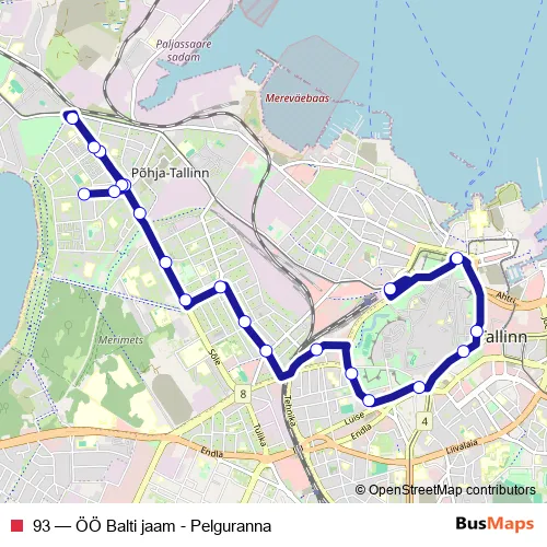The first stop of the 93 bus route is Balti jaam 4 (train station) and the last stop is Randla. 93 (ÖÖ Balti jaam - Pelguranna) is operational during on weekends.