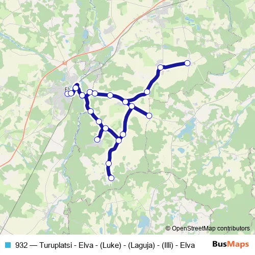 The first stop of the 932 bus route is Turuplatsi and the last stop is Elva. 932 (Turuplatsi - Elva - (Luke) - (Laguja) - (Illi) - Elva) is operational during everyday.
