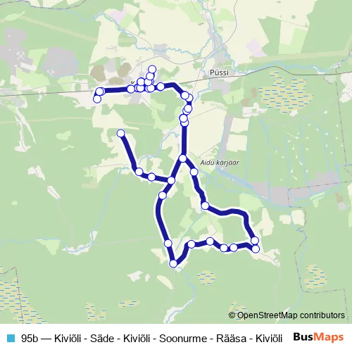 The first stop of the 95b bus route is Keskuse and the last stop is Lasteaia. 95b (Kiviõli - Säde - Kiviõli - Soonurme - Rääsa - Kiviõli) is operational during everyday.